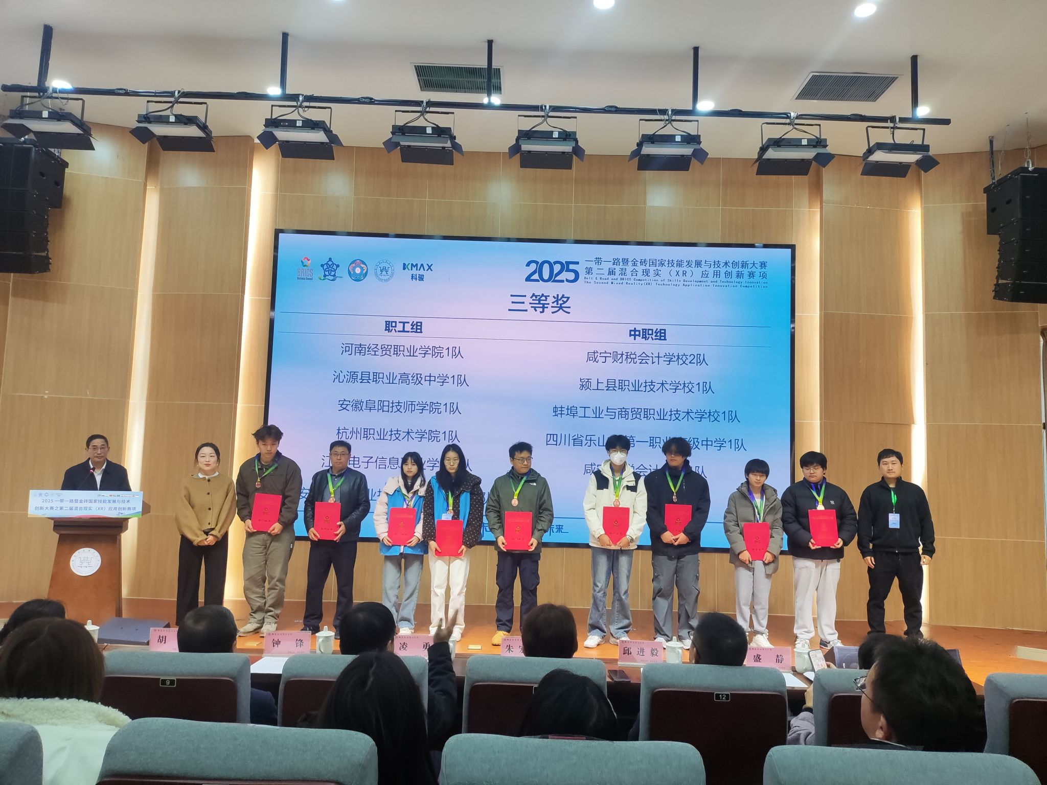 11月23日,2025一带一路暨金砖国家技能发展与技术创新大赛混合现实(XR)技术应用创新赛项全国总决赛在铜陵职业技术学院举行。本次大赛,共有来自全国各地59所院校,109支代表队,210名参赛,我校学生曾佳妮、蔡妍;郝心语、程洁瑜组队代表学校参赛,经过激烈的角逐最终荣获二个团体三等奖。